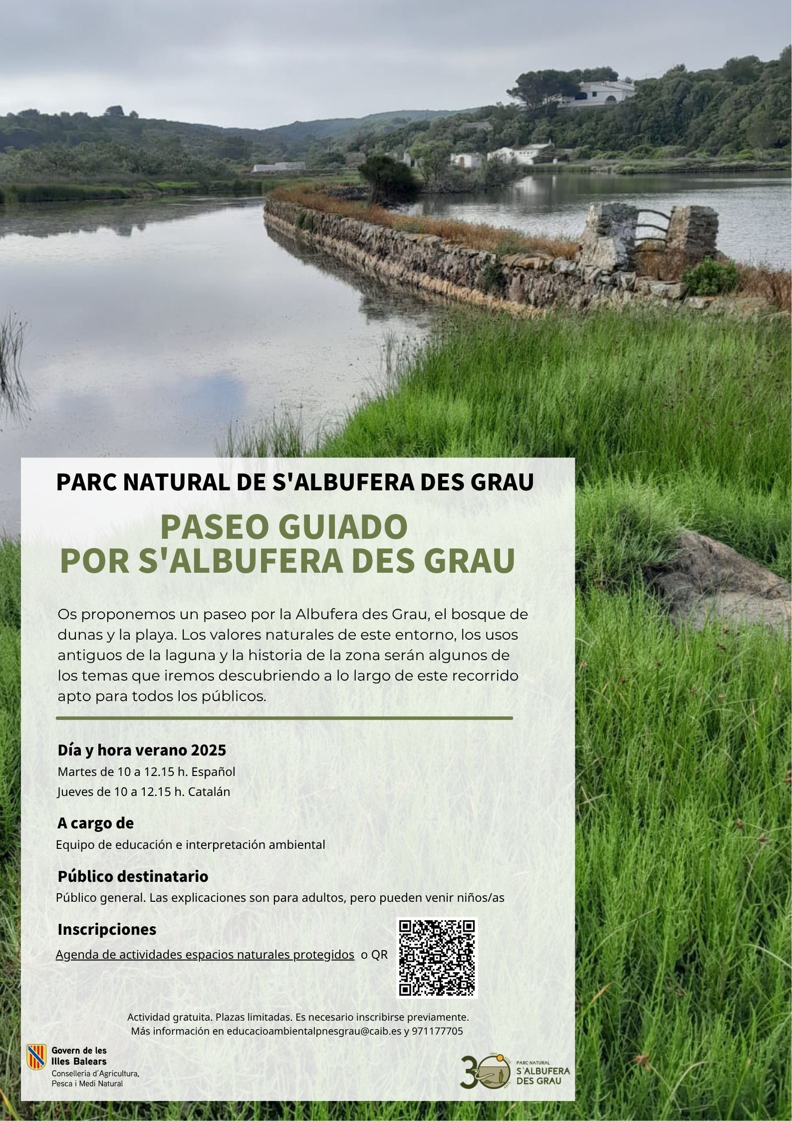 DESCRIPCIÓN: Os proponemos un paseo por la Albufera des Grau, el bosque de dunas y la playa. Los valores naturales de este entorno, los usos antiguos de la laguna y la historia de la zona serán algunos de los temas que iremos descubriendo a lo largo de este recorrido apto para todos los públicos. Los martes en español y los jueves en catalán.