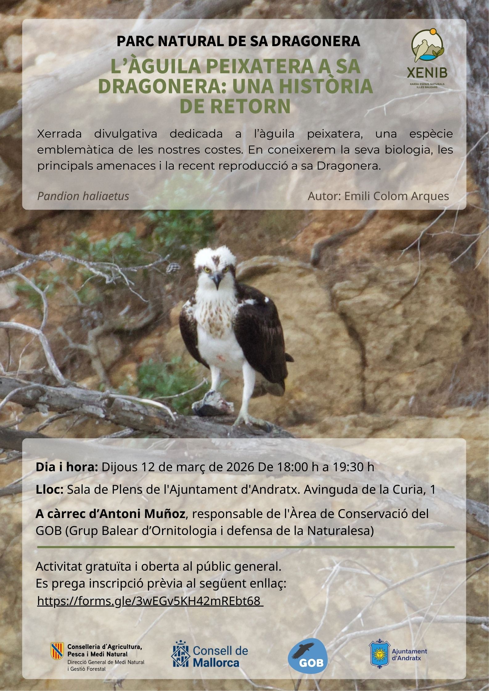 DESCRIPCIÓN: Charla divulgativa sobre el águila peixetera, una especie emblemática de nuestras costas. conoceremos su biología, las principales amenazas y su reciente reproducción en el Parque natural de sa Dragonera .