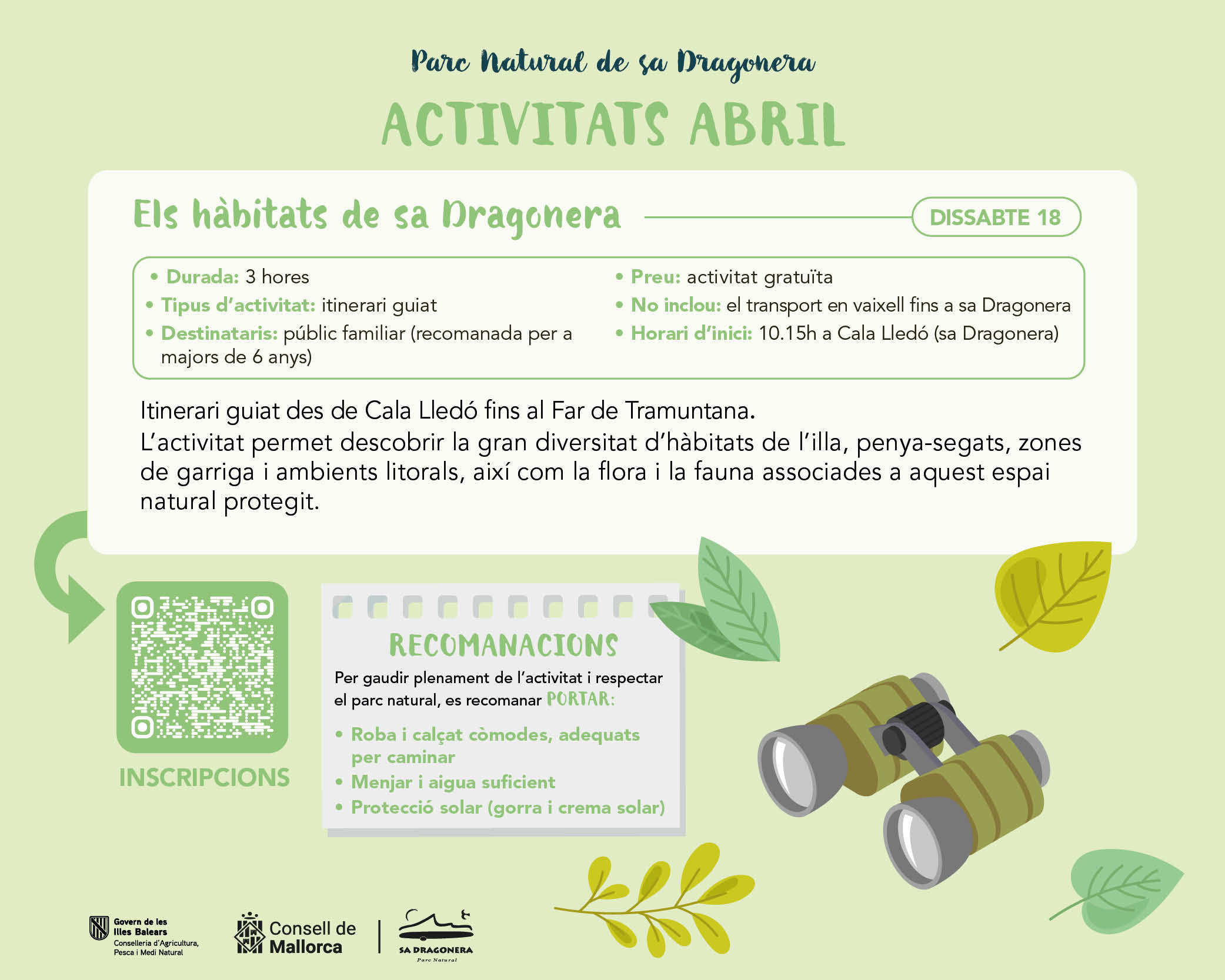 AVISO IMPORTANTE: Por incriure's, hay que rellenar el formulario. Si se superan las plazas disponibles día 13 de abril se hará un sorteo. Si tenéis qualque duda podéis contactar a educacioambientalpnesgrau@caib.es y al teléfono 971177705.