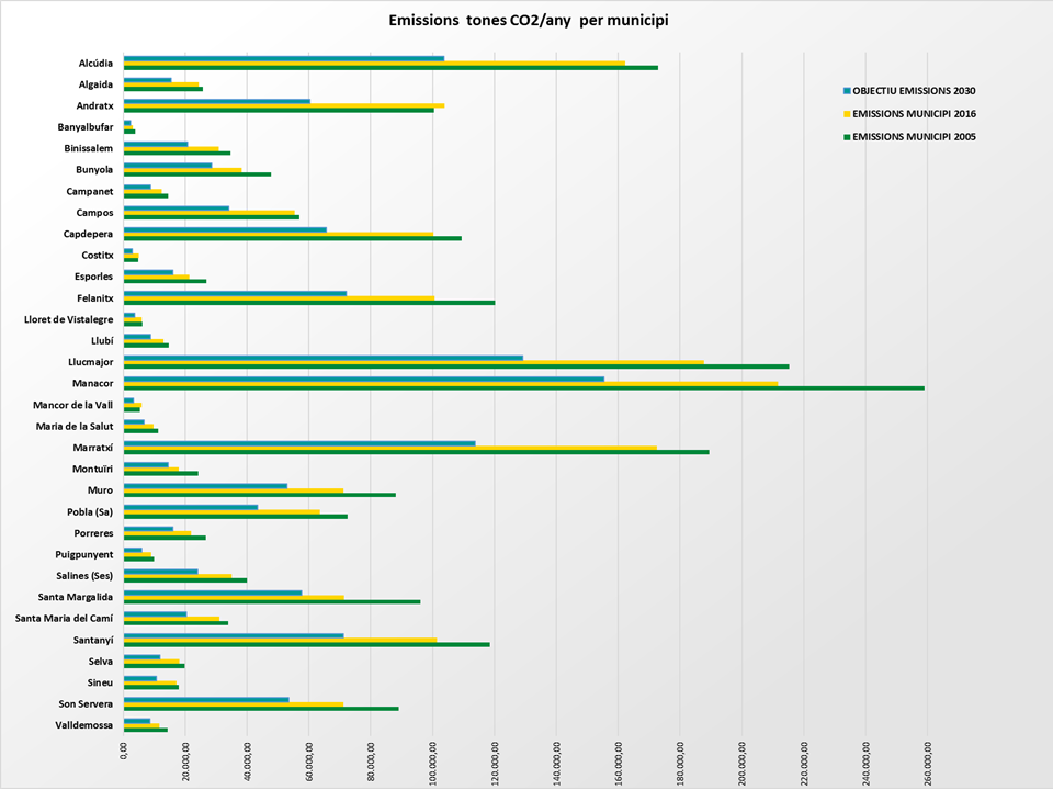 La tabla a continuación muestra una comparativa de las diferentes emisiones de CO2 en Toneladas por año para los municipios que han redactado sus PAESC, desde el año de referencia 2005, hasta el año 2030 para el que han asumido el compromiso de reducirlas.