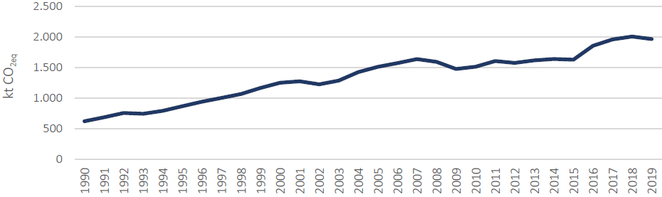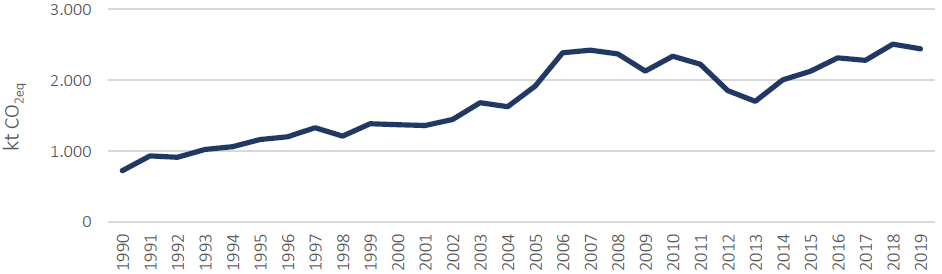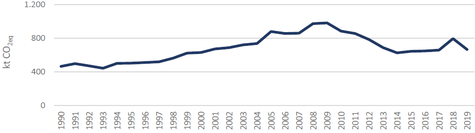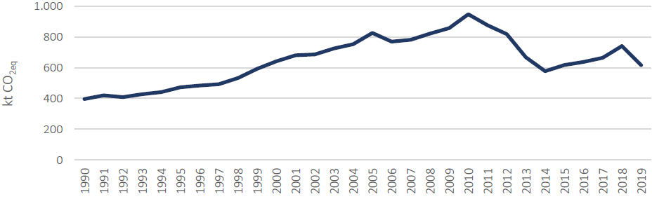 Este sector es bastante constante en su crecimiento, empezando con 240,01 ktCO2eq en 1990 y llegando a 673,17 *ktCO2eq en 2019. A pesar de que en los últimos años las emisiones muestran unos “dientes de sierra”, la tendencia general es al alza.