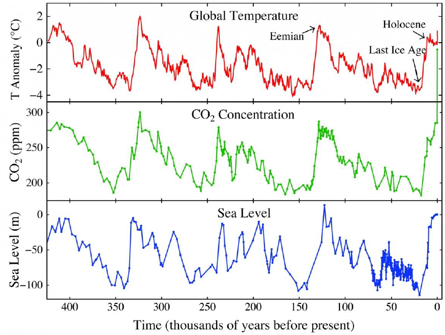 Figura 2. Evolución de la temperatura, concentración de CO2 y nivel del mar. Fuente: Johnenglander