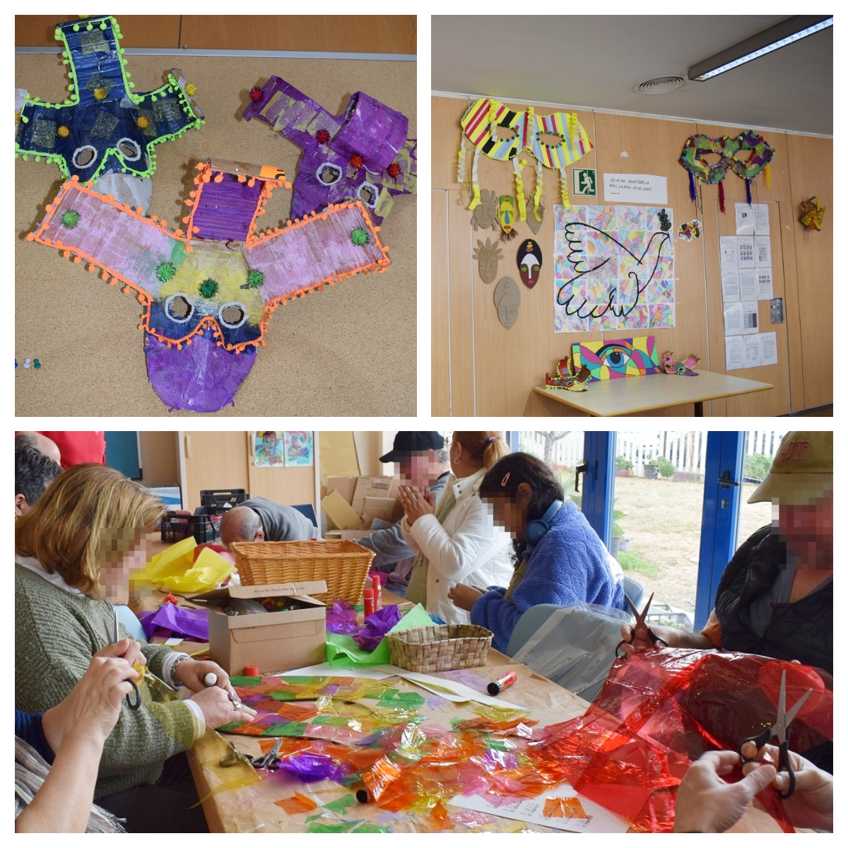 Este año se ha optado por el trabajo grupal donde los usuarios y las usuarias han echo la elección de los compañeros para su equipo y han realizado tres grandes antifaces con diferentes técnicas además de crear su propia máscara con técnica libre y reciclar los trabajos carnavalescos de otros años.