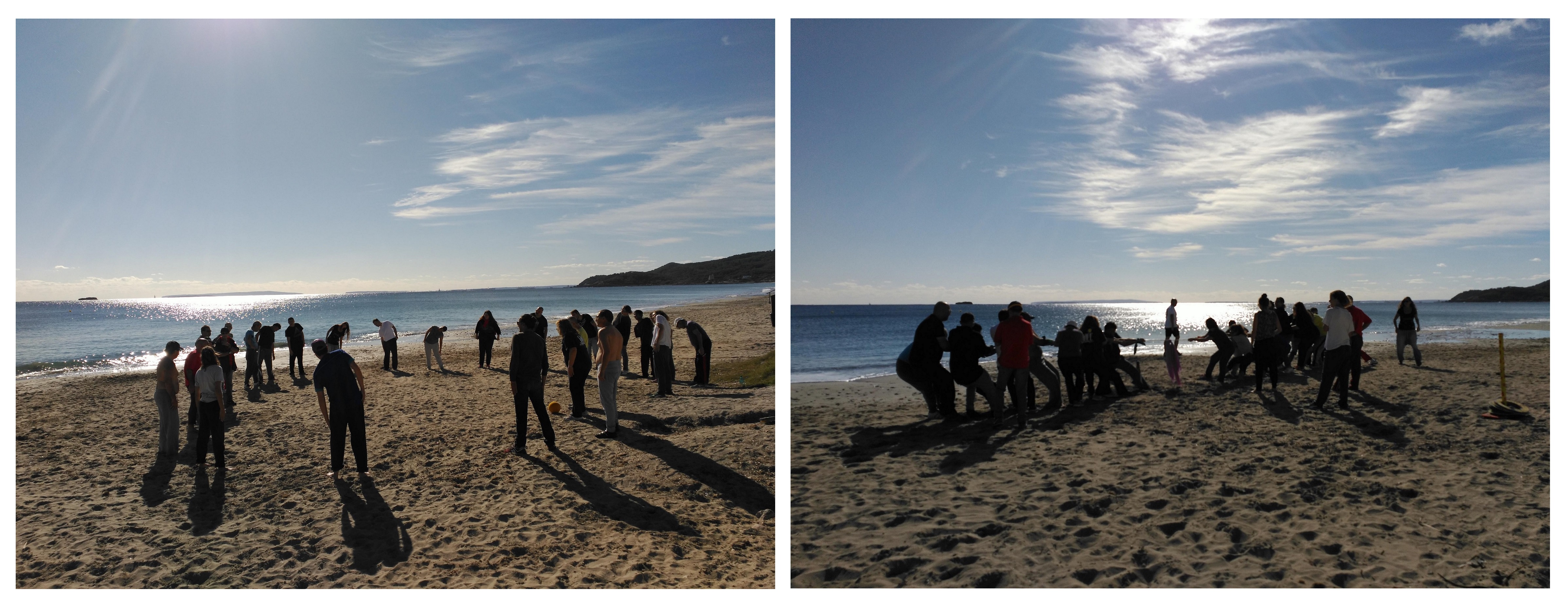 El día comenzó a las 10.30 h con calentamientos y presentaciones, después en grupos se hicieron diferentes pruebas como la cuerda, balón-tiro, lanzamiento de peso y relevos.