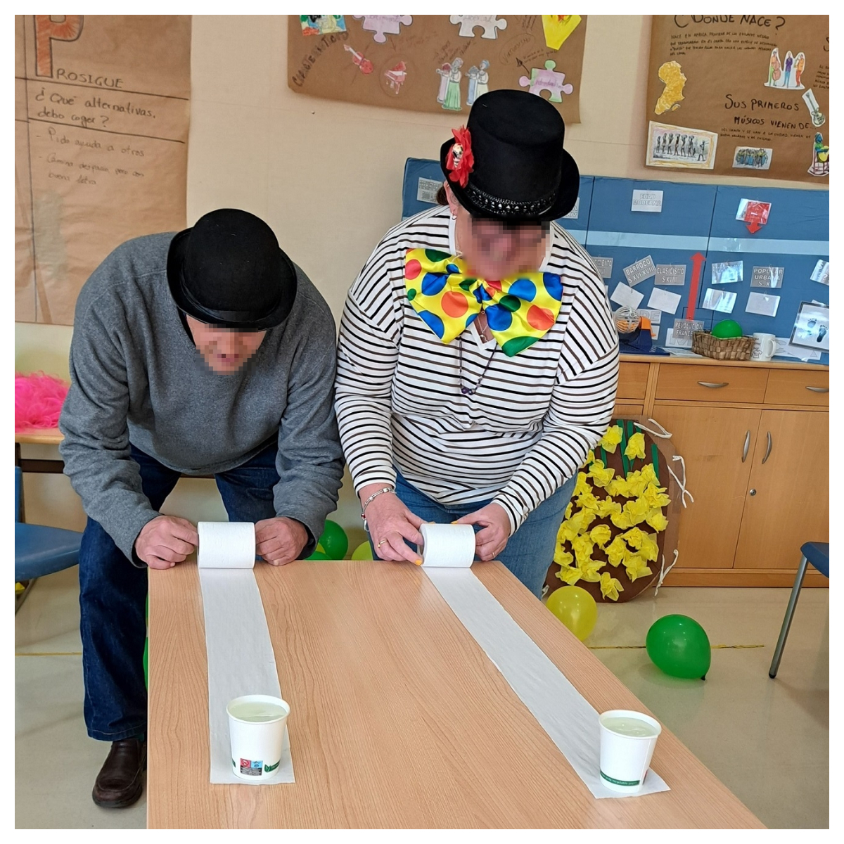 El viernes día 24 celebramos la fiesta de carnaval en el centro de día de salud mental en la sala del gimnasio, previamente decorada con globos, objetos de disfraz hechos por las personas usuarias en los años anteriores y otros objetos comprados, como gorras, pañuelos, gafas, etc.