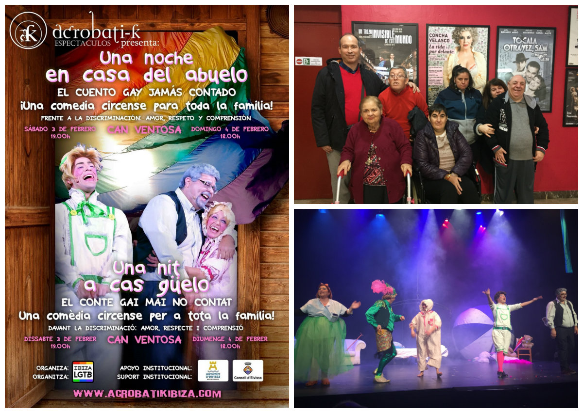Los usuarios de la Residencia y Centro de Día Can Raspalls pudieron disfrutar, el pasado 2 de febrero, del estreno de la obra Una noche en casa del abuelo. El cuento gay jamás contado en el Centro Cultural Can Ventosa, de Eivissa. La obra de teatro, destinada a todos los públicos, logró mantener el interés de los espectadores de principio a fin. Los usuarios asistentes participaron activamente y quedaron asombrados de las acrobacias que realizaron los actores. La obra, de la compañía Acrobati-K, proclama un mensaje de amor, tolerancia y paz para concienciar contra el bullying.