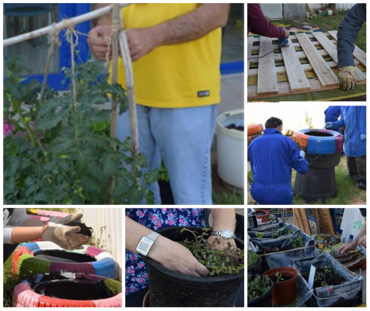 Se han decorado neumáticos donde se plantan los esquejes y los semilleros que se van elaborando, y se ayuda a los usuarios a identificar y obtener los recursos necesarios para el mantenimiento y disfrute del jardín.