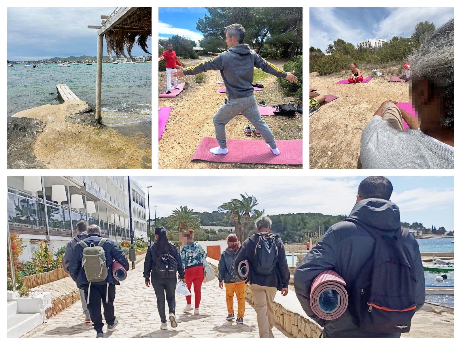 Haciendo un agradable paseo hasta el final de paseo marítimo de Talamanca, nos colocamos en el bosque al lado de los embarcaderos, siendo un sitio agradable y tranquilo para la clase de Yoga.