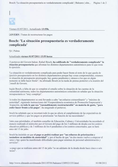 ...."El protavoz se ha referido también a la advertencia realizada por el Consell Económico y Social, de que si la situación de dificultad económica continúa habrá problemas en el sistema sanitario y ha admitido que "es verdad que es la situación especialmente complicada" en la Conselleria de Salud..