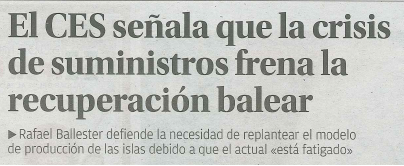 El CES señala que la crisis de suministros frena la recuperación balear: Rafael Ballester defiende la necesidad de replantear el modelo de producción de las islas debido a que el actual "está fatigado"