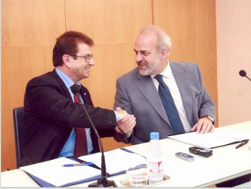 El conseller Moragues i el president del CES, Llorenç Huguet, en l'acte de signatura del conveni