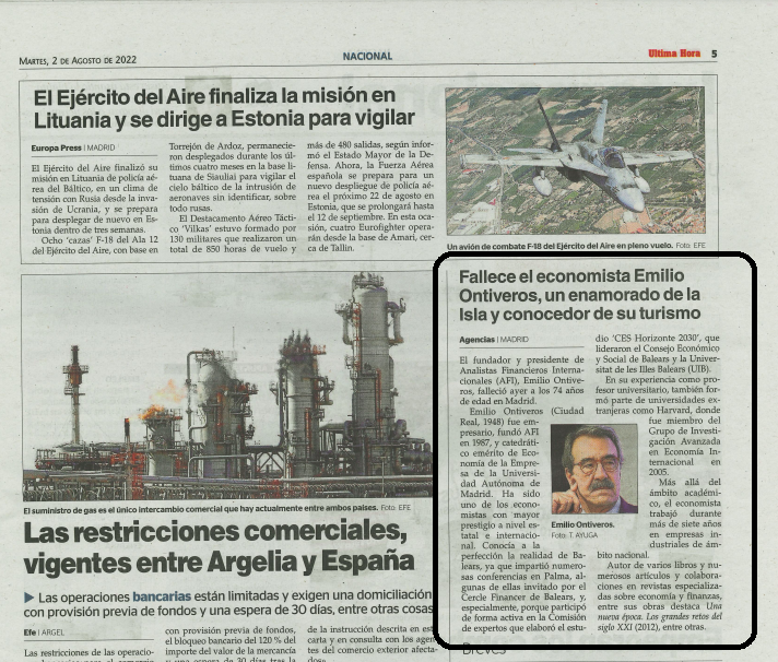 Article del diari Ultima Hora on es menciona que Emilio Ontiveros va prendre part a la Comissió d'experts que va elaborar l'estudi "CES Horizonte 2030" liderat pel CES i la UIB