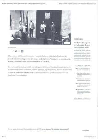 El presidente del Consejo Económico y Social de Baleares (CES), Rafael Ballester, ha tomado este miércoles posesión del cargo con el objetivo de "trabajar en la mejora social, laboral y económica" ante la crisis derivada de la COVID-19.