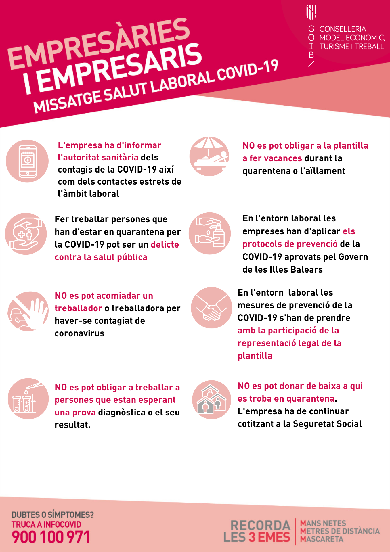 Si una empresa puede continuar con su actividad y un trabajador o trabajadora se contagia de coronavirus por la realización de su trabajo: se entenderá como accidente laboral (esto implica que se reconocen las indemnizaciones por defunción, responsabilidades civiles o penales si toca, recargo en las prestaciones...). Es responsabilidad de las empresas garantizar las medidas de seguridad.