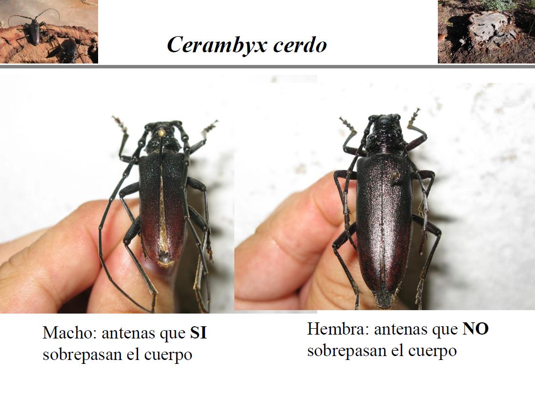 - Ara a juny surten els adults del Cerambyx cerdo. Per poder identificar si son mascles o femelles, adjuntam una foto aclaratòria.
