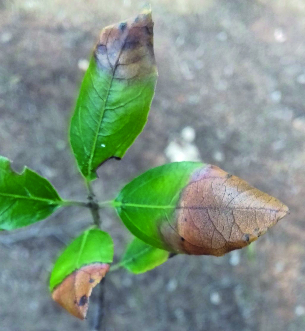 | Rhamnus alaternus afectat per X. fastidiosa. Fotografia: Jose Fidel Garzón. | Rosmarinus officinalis afectat per Xylella fastidiosa.Fotografia: Carlos Daza. |