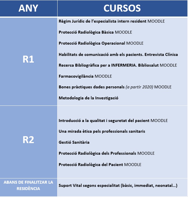 El residente ha de realizar los cursos correspondientes a cada año de residencia según la tabla siguiente: