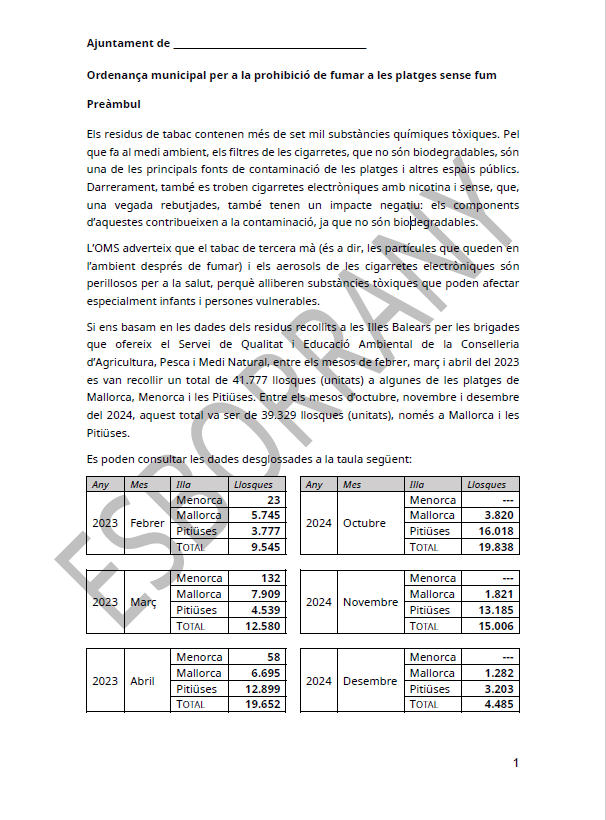Es por esto que los ayuntamientos interesados se pueden descargar el siguiente modelo de ordenanza, elaborado con la col·laboración de la FELIB, para adaptarlo a su idiosincrasia y así poder regular el hecho de fumar en las playas adheridas a la campaña.