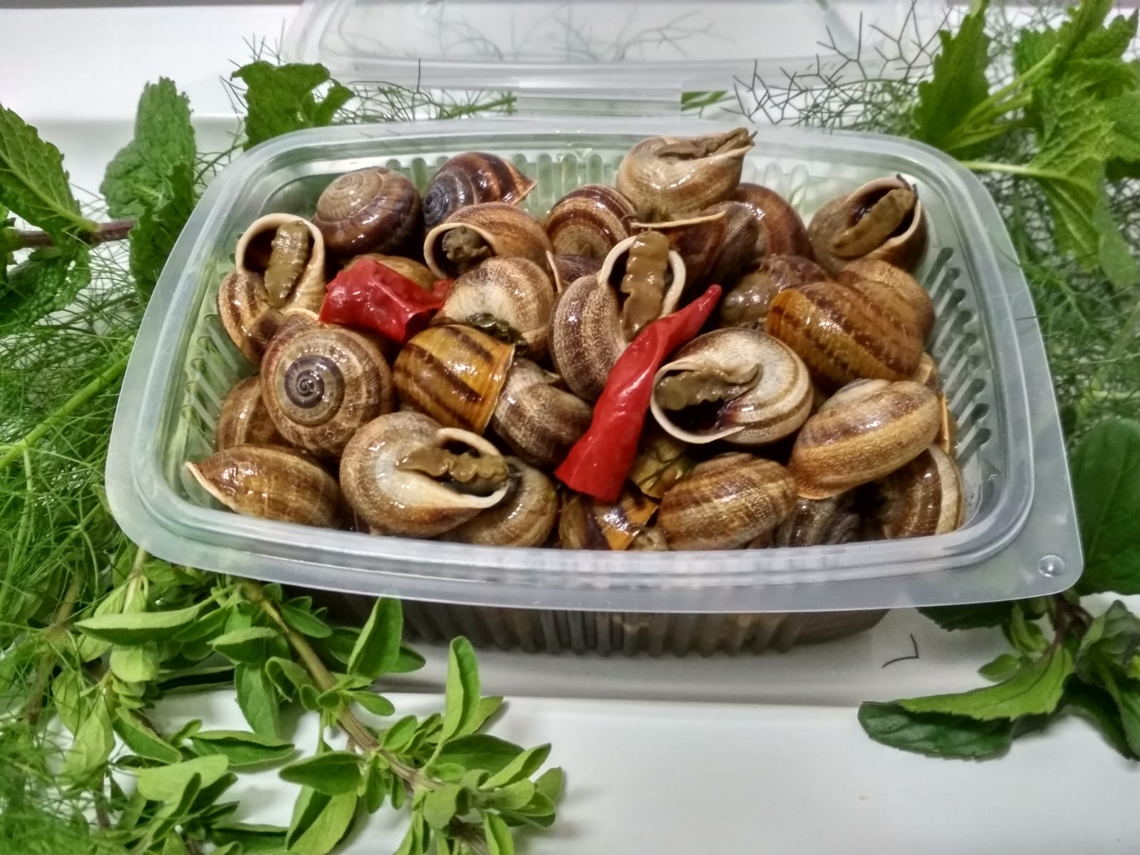 Caracoles vivos y caracoles cocinados.