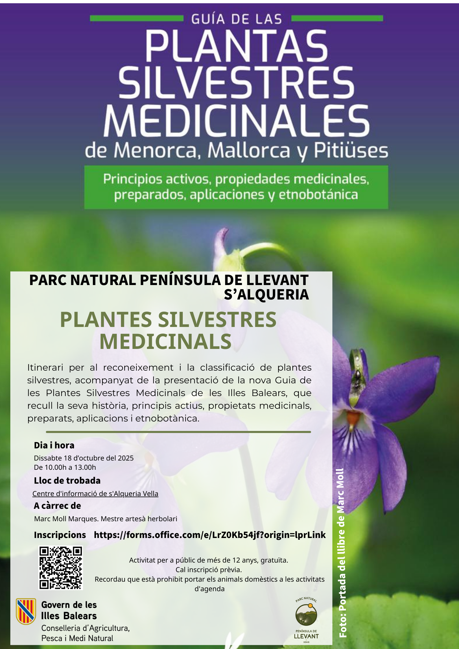 DESCRIPCIÓ: Itinerari per al reconeixement i la classificació de plantes silvestres, acompanyat de la presentació de la nova Guia de les Plantes Silvestres Medicinals de les Illes Balears, que recull la seva història, principis actius, propietats medicinals, preparats, aplicacions i etnobotànica.