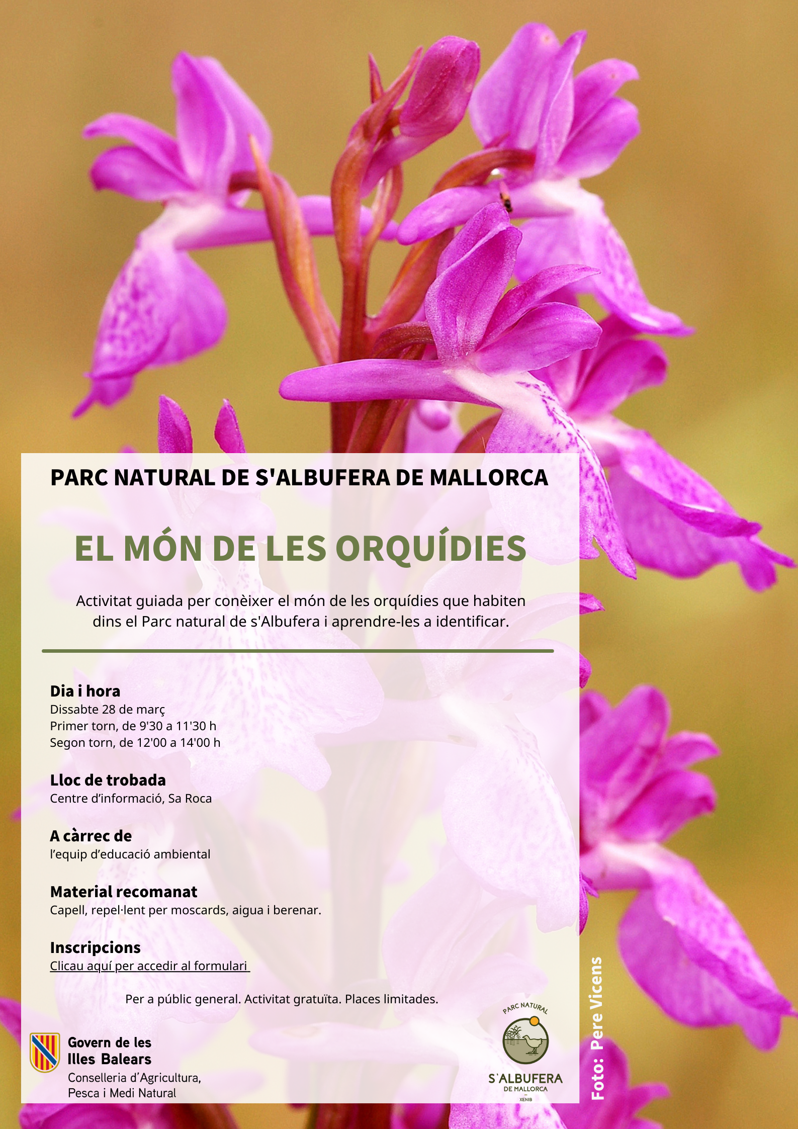 DESCRIPCIÓ: Les orquídies és una família de plantes molt interessant. Al Parc natural de Mondragó hi ha fins a 13 espècies diferents. Farem un recorregut per conéixer la majoría de les espècie que hi trobam, així com aprende una mica sobre la seva biologia i altres curiositats.
