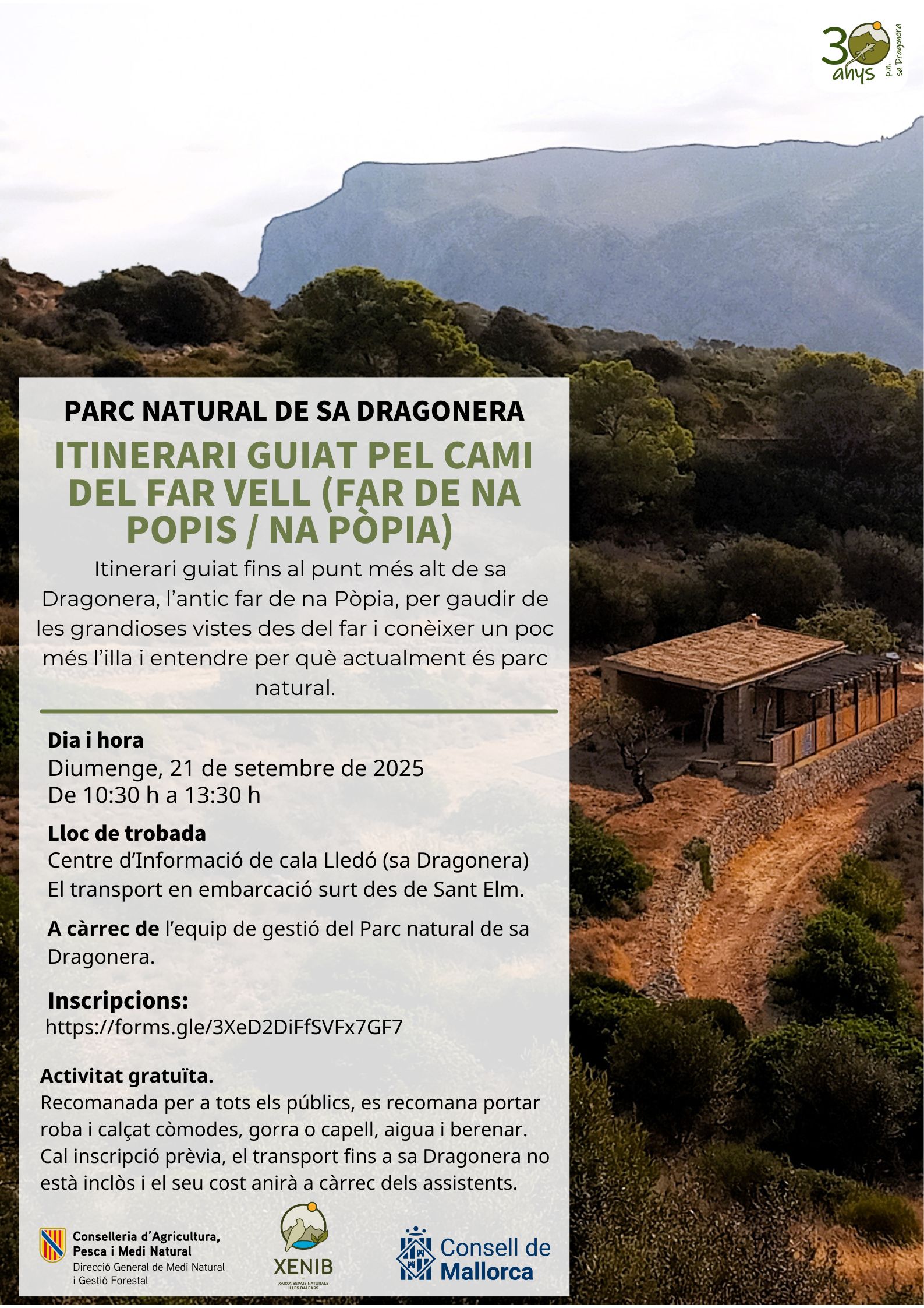 DESCRIPCIÓN: Itinerario guiado hasta la cima de la isla de sa Dragonera, donde se encuentra el antiguo faro de na Pòpia, para disfrutar de las impresionantes vistas desde el faro y conocer un poco mejor la isla y comprender porqué actualmente es un parque natural.