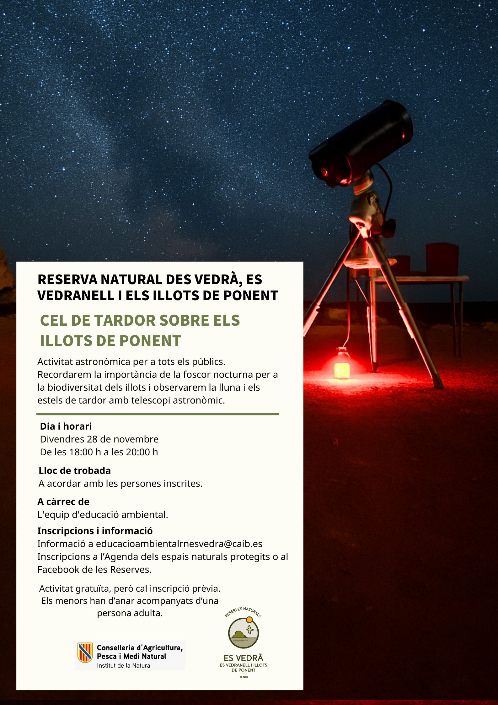 DESCRIPCIÓN: Actividad astronómica para todos los públicos. Recordaremos la importancia de la oscuridad para la biodiversidad de los islotes y observaremos la luna y las estrellas de otoño con telescopio astronómico.