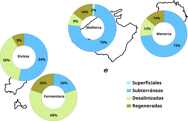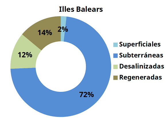 Como se puede observar en la tabla y en los gráficos siguientes, las aguas subterráneas son la principal fuente de recursos disponibles en las Illes Balears, si bien se encuentran diferencias importantes por islas en cuanto a los porcentajes.