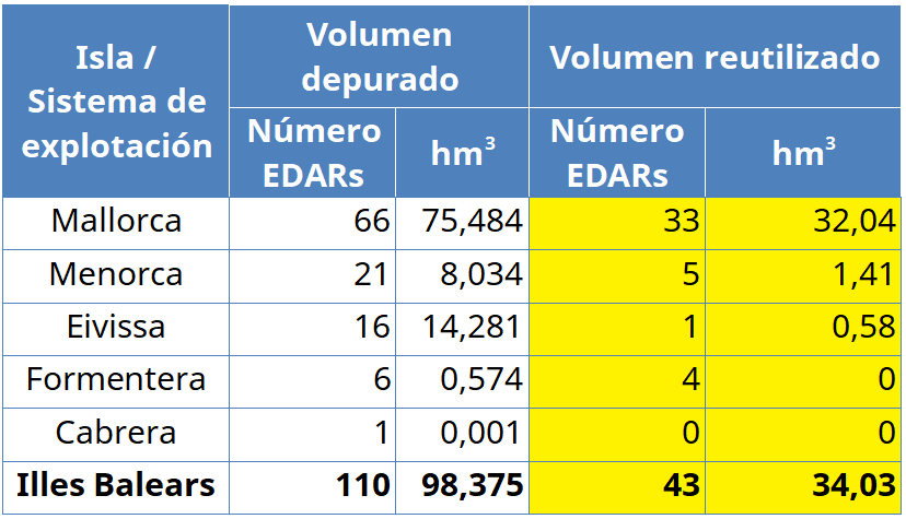 Actualmente, según los datos de las cuales dispone la Dirección General de Recursos Hídricos, se reutiliza parcialmente el agua residual regenerada de treinta y tres EDAR en Mallorca, cinco en Menorca y una en Ibiza. Además, algunas de las EDAR particulares (especialmente de hoteles y agroturismos) utilizan parte de los volúmenes de agua residual para el riego de los propios jardines.