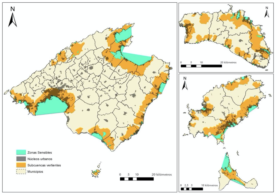 En las Islas Baleares, mediante el Decreto 49/2003, de 9 de mayo, se declararon las zonas sensibles, normales y menos sensibles en las aguas del litoral. En estas zonas los vertidos procedentes de plantas de tratamiento de aguas residuales urbanas tienen que dar cumplimiento a requisitos adicionales a los convencionales, para minimizar el riesgo de eutrofización. Estas zonas se designan atendiendo a criterios de eutrofización actual o potencial, capacidad de absorción del medio y usos posteriores de las aguas.