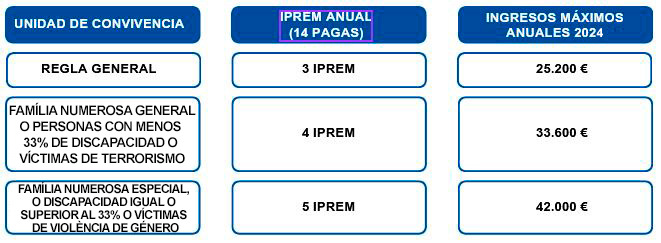 - Todas las personas que residan en la vivienda no deben superar, conjuntamente, el límite de ingresos máximos (según la tabla siguiente):