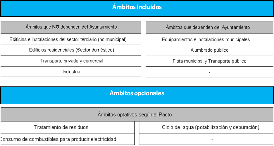 Para establecer los objetivos del Pacto se deben identificar y diferenciar todos los ámbitos dentro del territorio del municipio, con influencia en las emisiones producidas y sobre los que se puede intervenir. De los ámbitos incluidos dentro del término municipal, según la definición de la CoMo, no es obligatorio actuar en todos, sino sólo en los que las entidades locales tienen competencia para actuar directamente o indirectamente.