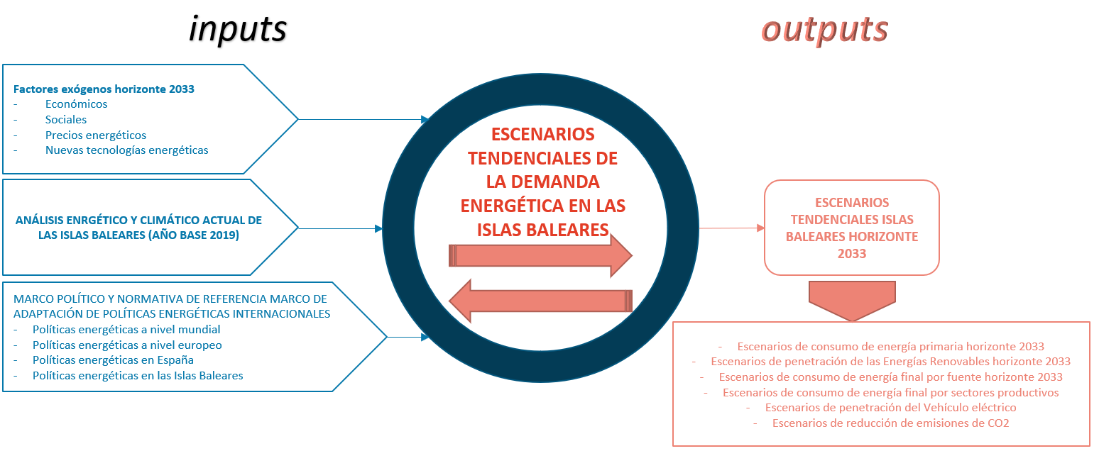 En l'escenari tendencial s'aprecia una disminució de les emissions totals. El major causant d'aquesta disminució és la nova interconnexió amb la península prevista per al 2026-2027. L'energia importada de la península augmentarà, disminuint l'ús de combustibles per a generació elèctrica d'alt factor d'emissió a Illes Balears. A més, aquesta energia importada, pel fet que el mix de generació peninsular té un factor d'emissió molt inferior al de la generació elèctrica a Illes Balears, aportarà menys emissions. La millora de l'eficiència energètica i una major presència de renovables també afavoreixen aquesta disminució. No obstant això, la reducció d'emissions en aquest escenari no és suficient per a aconseguir l'objectiu de la Llei 10/2019. Respecte a 1990, les emissions es preveuen un 3% superiors.