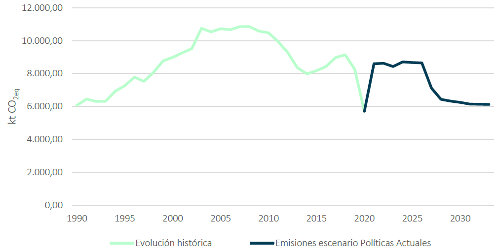 La següent il·lustració mostra les emissions en l'escenari tendencial o de Polítiques Actuals. Les emissions representades de 1990 a 2020 són les publicades en els inventaris d'emissions GEH del Govern de les Illes Balears, adaptant alguns valors a la realitat insular: