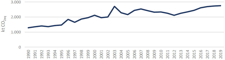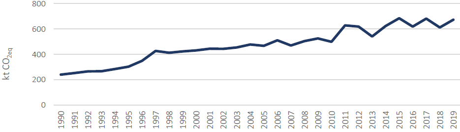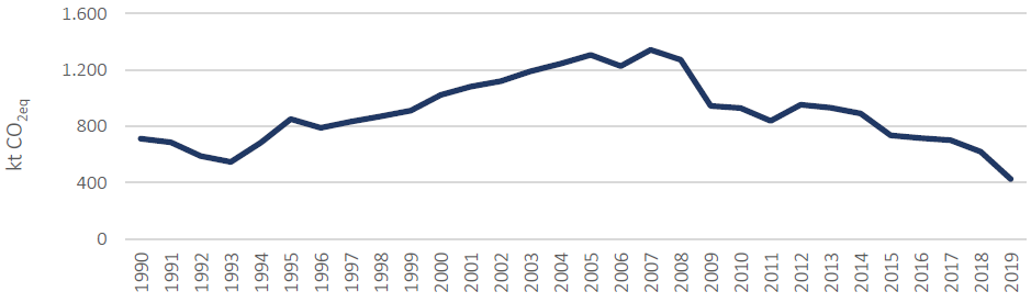 Este sector es bastante constante en su crecimiento, empezando con 240,01 ktCO2eq en 1990 y llegando a 673,17 *ktCO2eq en 2019. A pesar de que en los últimos años las emisiones muestran unos “dientes de sierra”, la tendencia general es al alza.