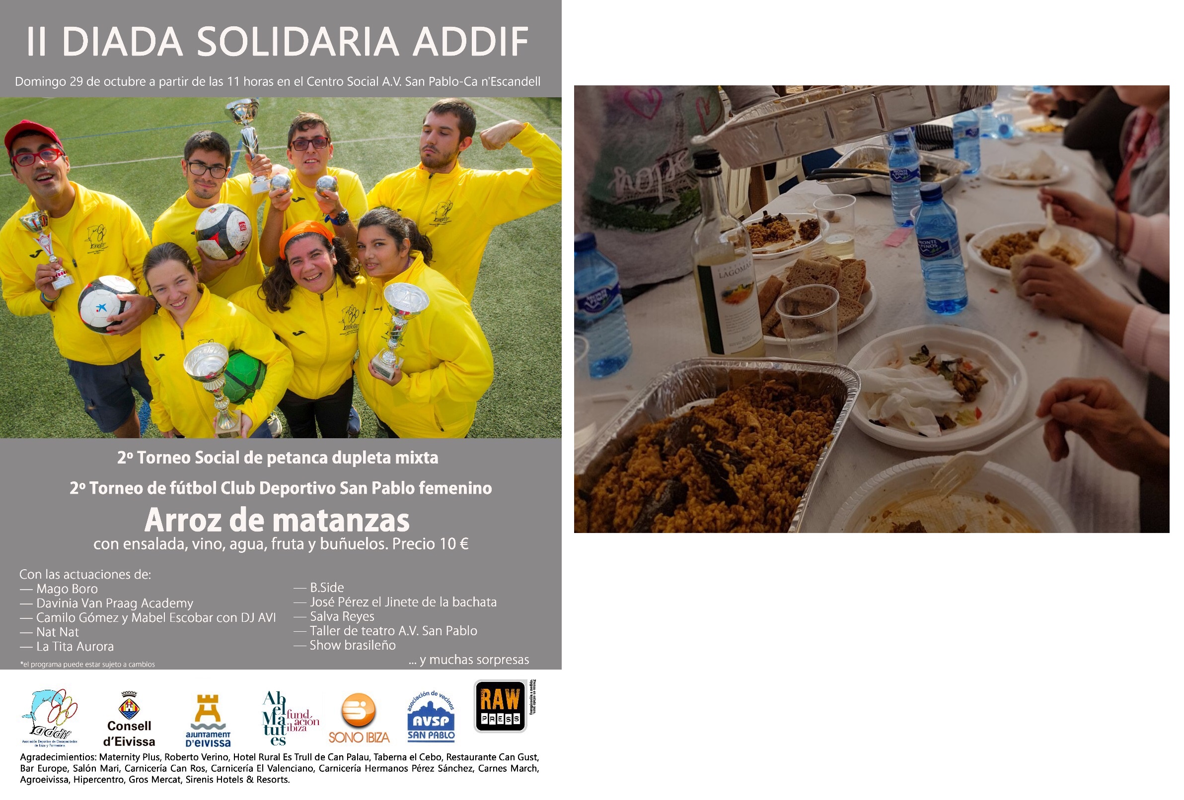 El passat diumenge 29 d’octubre, un grup d’usuaris de la Residència Can Raspalls varen fer una sortida per assistir a la II Diada Solidària d’ADDIF, l’Associació d’Esportistes Discapacitats d’Eivissa i Formentera, a la qual estan associats alguns dels residents del centre. Durant la jornada, els assistents varen poder veure tornejos de futbol i petanca, a més d’espectacles de màgia i actuacions musicals i de ball. A més, varen poder gaudir d’un bon àpat, que incloïa amanida, arròs de matances, fruita i beguda. Els assistents varen animar els companys que varen competir en els tornejos, i varen ser testimonis del lliurament de premis. Tots els usuaris s’ho varen passar molt bé i esperen tornar-hi l’any que ve.
