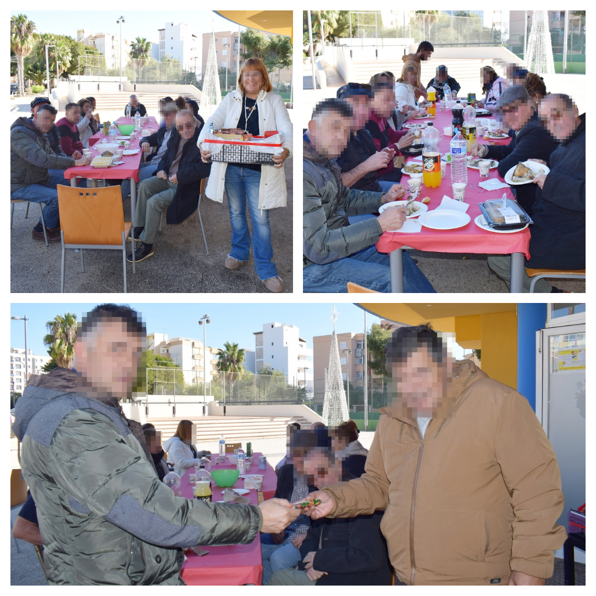 Se viste la mesa con mantel navideño y con el juego del bingo se reparten las cestas con productos que habían traído entre todos.