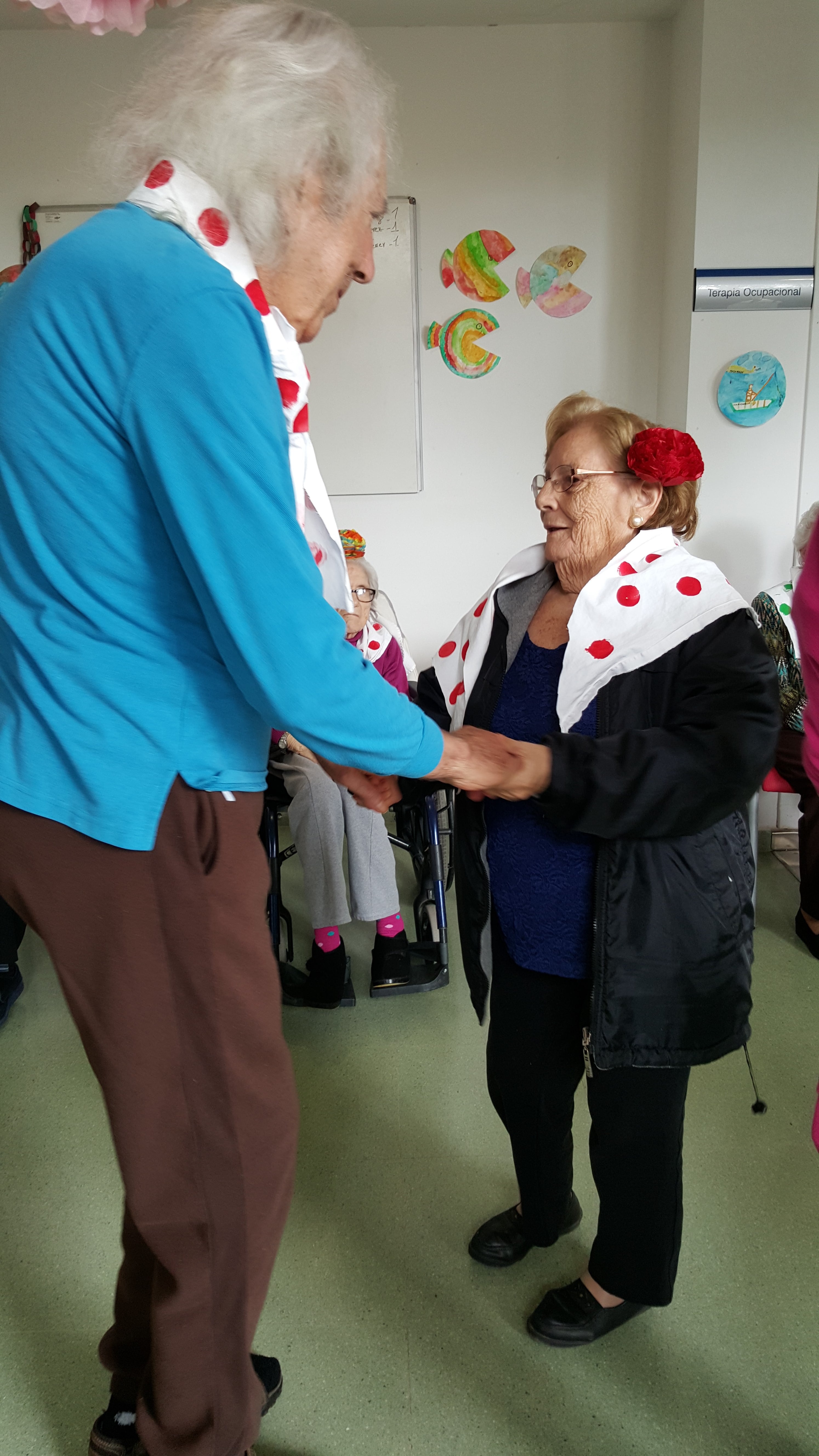 El pasado 28 de abril, aprovechando el taller de musicoterapia que se lleva a cabo de forma habitual en la Residencia de Can Blai a cargo de la terapeuta ocupacional y animadora sociocultural, celebramos la famosa “Feria Sevillana”. Como invitados participaron los alumnos del Instituto Xarc de Santa Eulària des Riu. Mediante los talleres de manualidades se hicieron claveles y pañuelos para todos los asistentes. Sobre la pista de baile se demostró que, además de grandes cantantes, son unos grandes bailarines.
