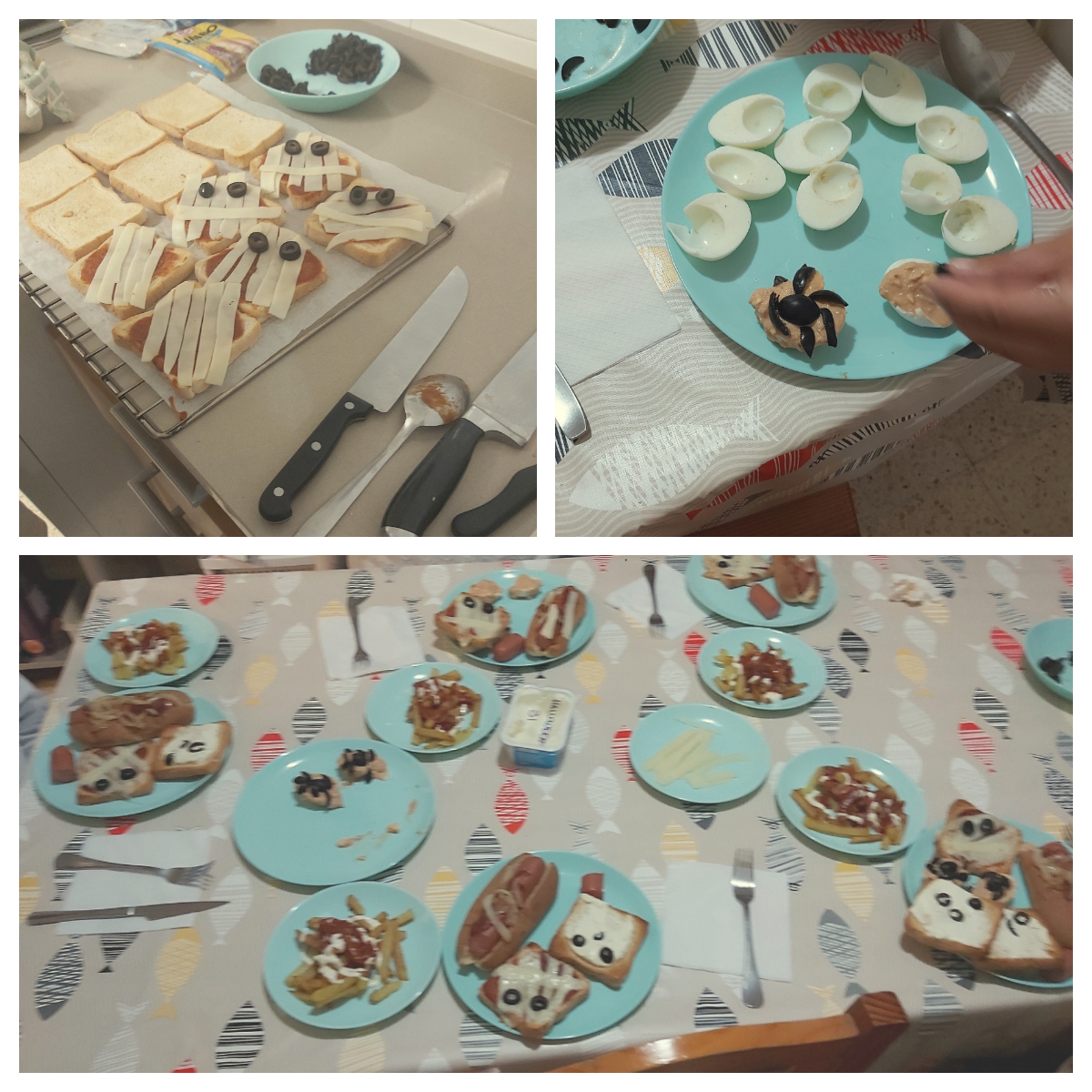 Ellas mismas eligieron el menú a preparar: huevos con arañas, salchichas con forma de dedos y bocadillos con caras de fantasmas. Para finalizar la noche vieron una película de terror.