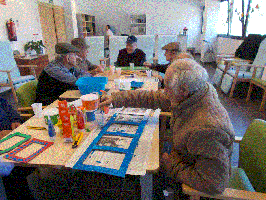 Las sesiones de creatividad semanales están siendo todo un éxito. La mayoría de las personas usuarias responden positivamente en participar en estos talleres. Hechos con cartones reciclados y pinturas, con estos marcos hemos decorado nuestra sala, creando un espacio más personalizado y, por tanto, potenciando más sentimiento de pertenencia. Además han servido como soporte para nuestras fotos para el rincón de reminiscencia sobre el cual trabajamos la memoria.