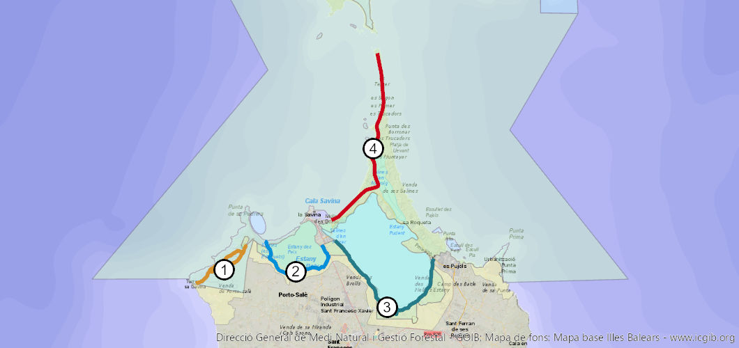 El parc, a l'illa de Formentera, te quatre itineraris senyalitzats por poder fer a peu.