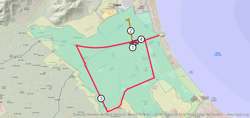 Descripción: Este itinerario es el más largo que se puede realizar en el Parque. Nos permite recorrer los diferentes ambientes que se encuentran y tomar contacto con parte del patrimonio etnológico de Albufera. Es un recorrido alrededor casi todo el Parque. El recorrido comienza frente al Centro de interpretación de Can Bateman; lo podemos visitar antes o después del itinerario. Nos permitirá conocer la historia de s’Albufera y nos introducirá en sus principales características físicas y biológicas.