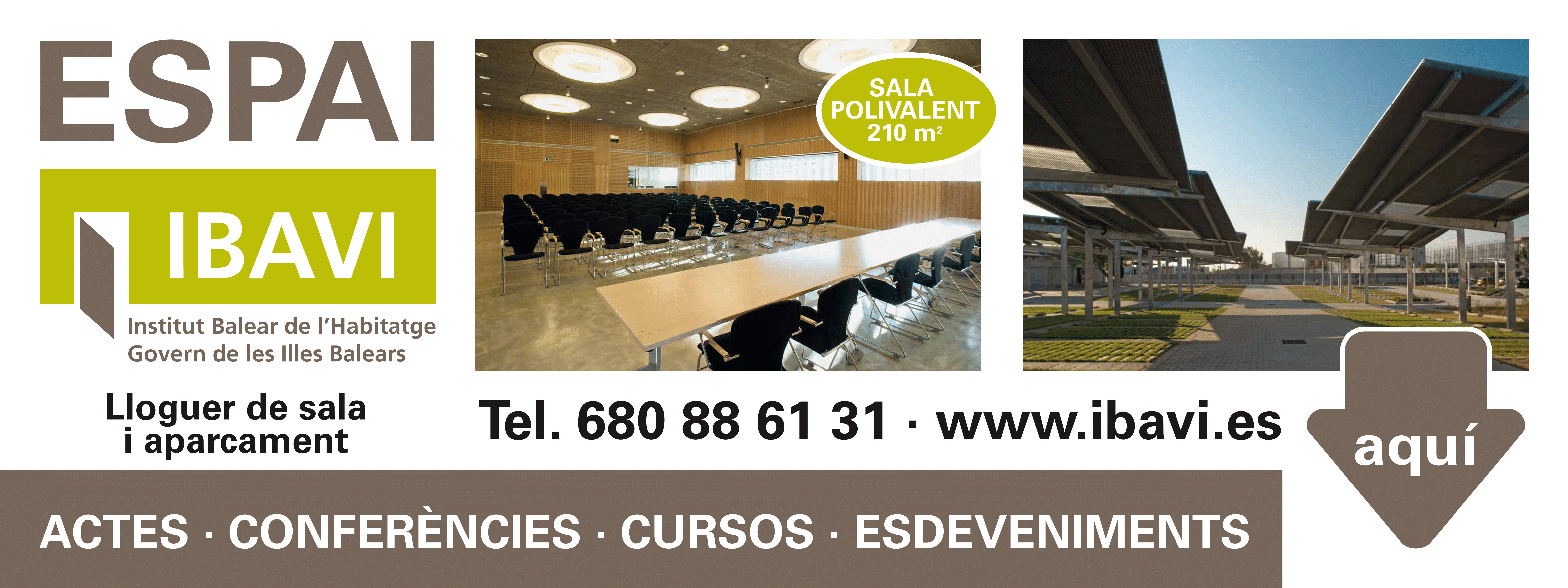 El IBAVI vuelve a poner en marcha el ESPAI IBAVI, un recinto en Palma donde celebrar una gran variedad de actos y eventos, como por ejemplo exposiciones, cursos, conferencias, reuniones, congresos, ponencias y mucho más. El ESPAI IBAVI consta de una sala polivalente de 210 m² con una capacidad para 235 personas y un completo equipamiento mobiliario que se puede distribuir de acuerdo con las necesidades particulares de cada evento. También dispone de un área de recepción, una oficina de trabajo y una cabina de control de sonido y proyecciones que ofrecen el apoyo logístico y técnico para cualquier ocasión. Además, para facilitar el acceso de los asistentes, el ESPAI IBAVI cuenta con una amplia zona de aparcamiento con 110 plazas cubiertas y espacios destinados al estacionamiento de autocares. Las instalaciones, rodeadas de una zona ajardinada, están situadas en la salida de la vía de cintura, muy bien comunicadas y de fácil acceso, tanto desde cualquier lugar de Palma como desde el aeropuerto. Más información en el correo espaiibavi@ibavi.caib.es o el teléfono 680 88 61 31. |
