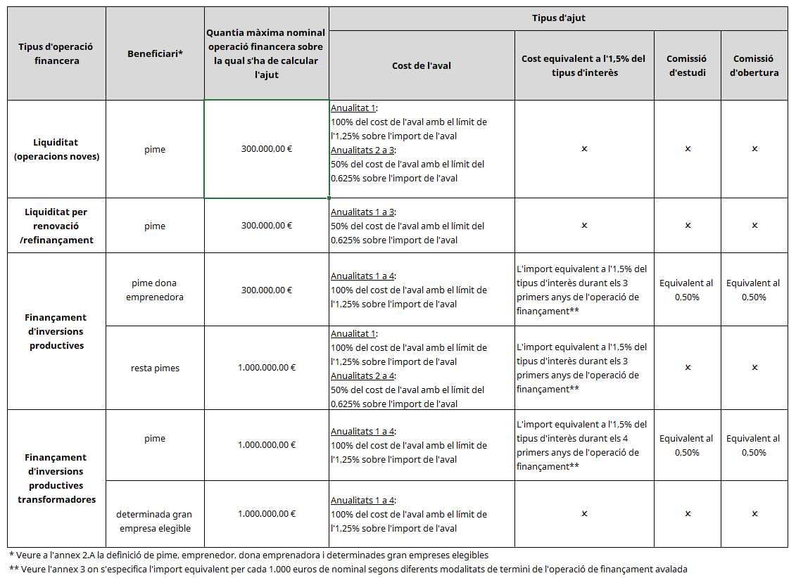 Tipus d'ajuts segons el beneficiari i l'operació financera (Annex 4 convocatòria)