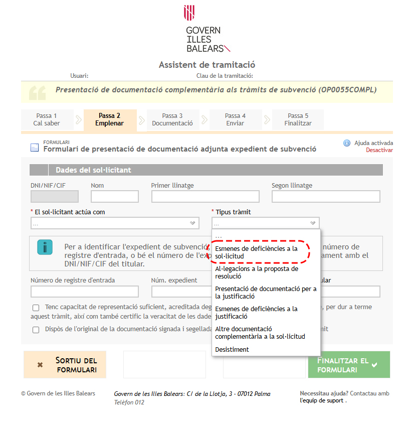 * Para subsanar deficiencias de sol·licitud se debe entrar en el trámite telemático de justificación y seleccionar "Esmena de deficiències a la sol·licitud" en el apartado "Tipus de tràmit".