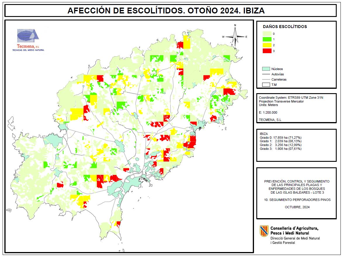 Mapa d'afectació perforadors pi. Eivissa. Tardor 2024
