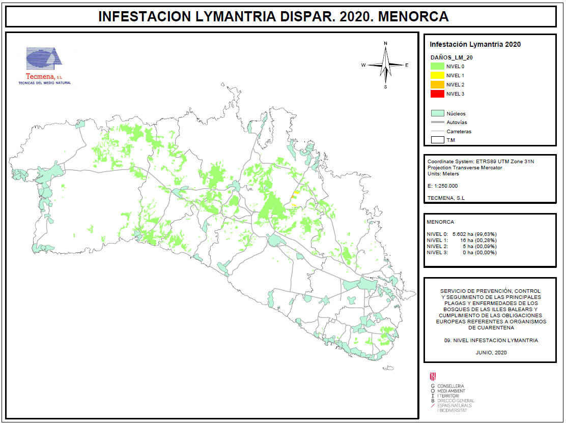Mapa d' afectació Lymantria dispar Menorca 2020