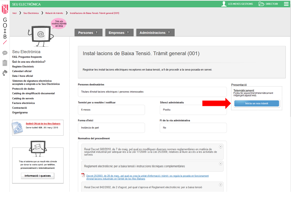 2. Seleccionau el tràmit: Dins la llista de tràmits de l'apartat Iniciar un tràmit d'aquesta web, seleccionau el tràmit corresponent.