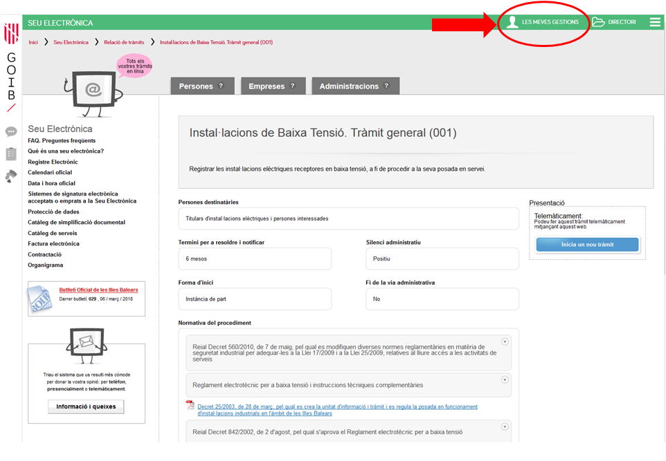 La zona personal es accesible desde Mis gestiones situado en el extremo superior derecho de la sede electrónica de la web de la CAIB. Es una zona de acceso exclusivo del usuario con certificado digital que permite gestionar los expedientes telemáticos tramitados.