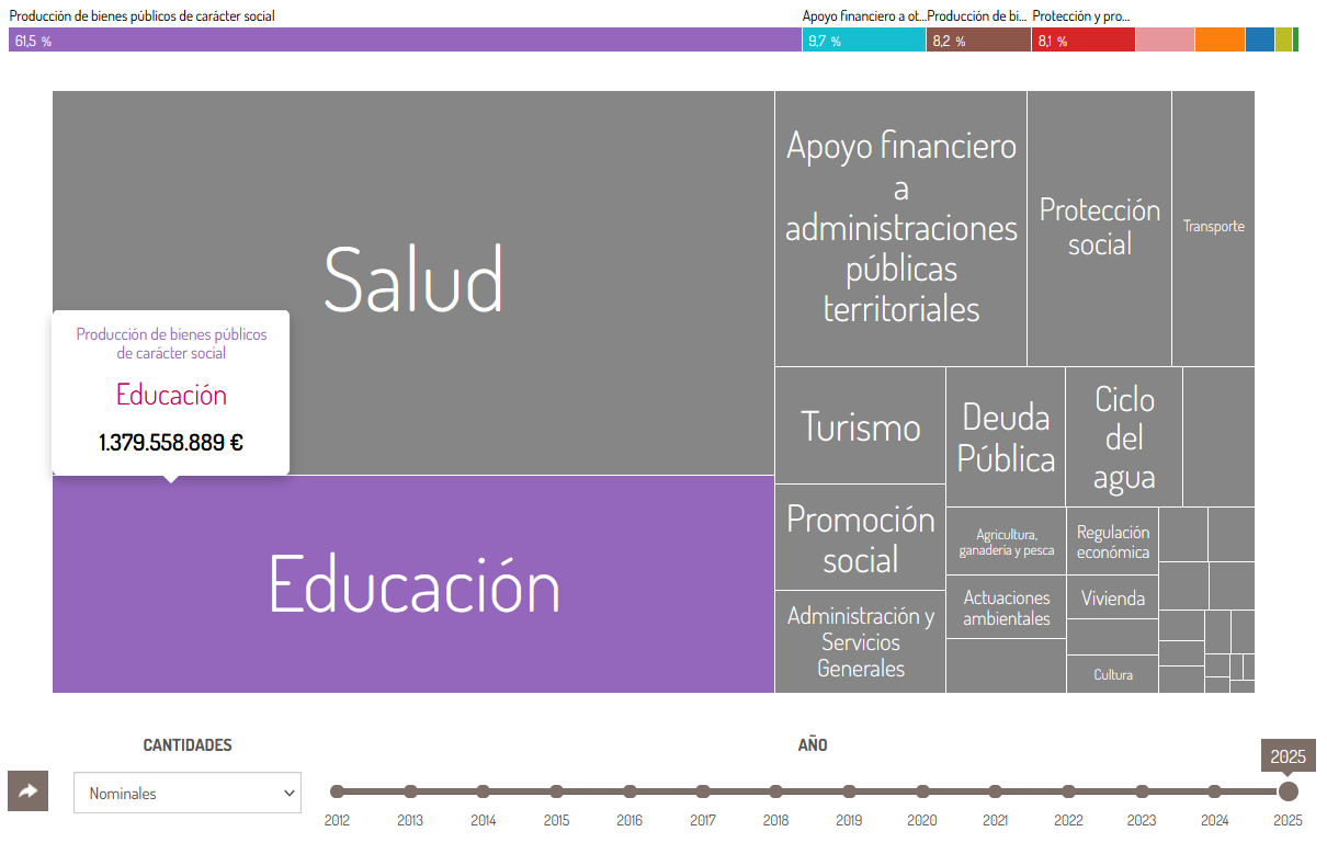 1. Entramos en https://pressupostsillesbalears.cat/es/politicas#view=functional y pinchamos en la política o servicio que nos interese. Por ejemplo, Educación: